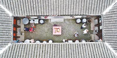 9月9日,江蘇省如皋市如城街道迎新社區(qū)居民用五谷擺成“70”字樣。