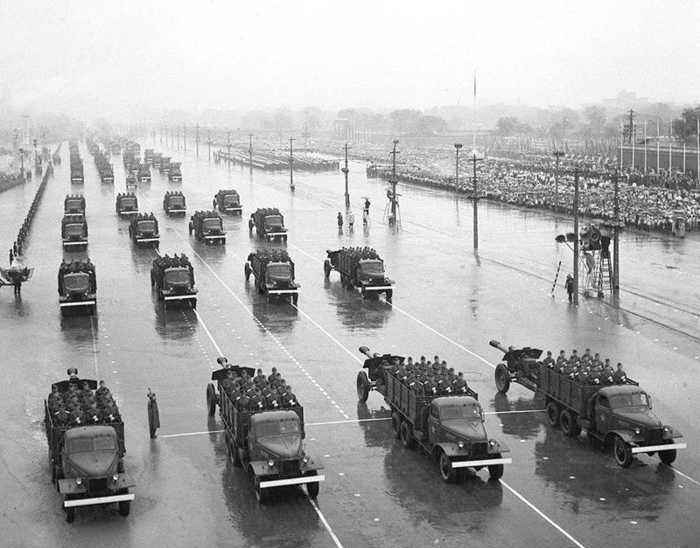 1956年,閱兵部隊乘坐的汽車是第一批出廠的國產(chǎn)解放牌汽車。