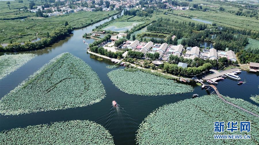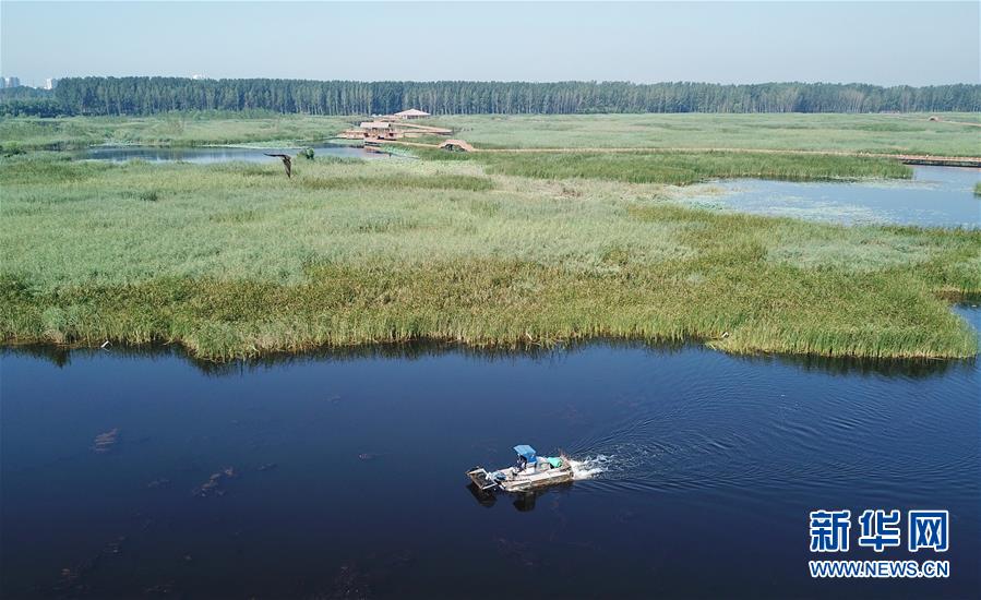 這是一艘打撈船在白洋淀景區(qū)內(nèi)清理漂浮物(8月31日無人機拍攝)。 新華社記者 牟宇 攝