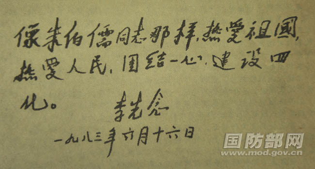 李先念題詞:“像朱伯儒同志那樣,熱愛祖國(guó),熱愛人民,團(tuán)結(jié)一心,建設(shè)四化。”(