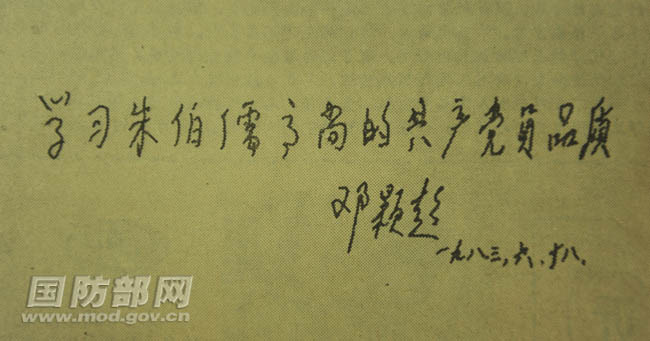 鄧穎超題詞:“學習朱伯儒高尚的共產(chǎn)黨員品質(zhì)”。(