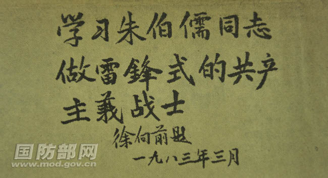 徐向前題詞:“學習朱伯儒同志 做雷鋒式的共產(chǎn)主義戰(zhàn)士”。(