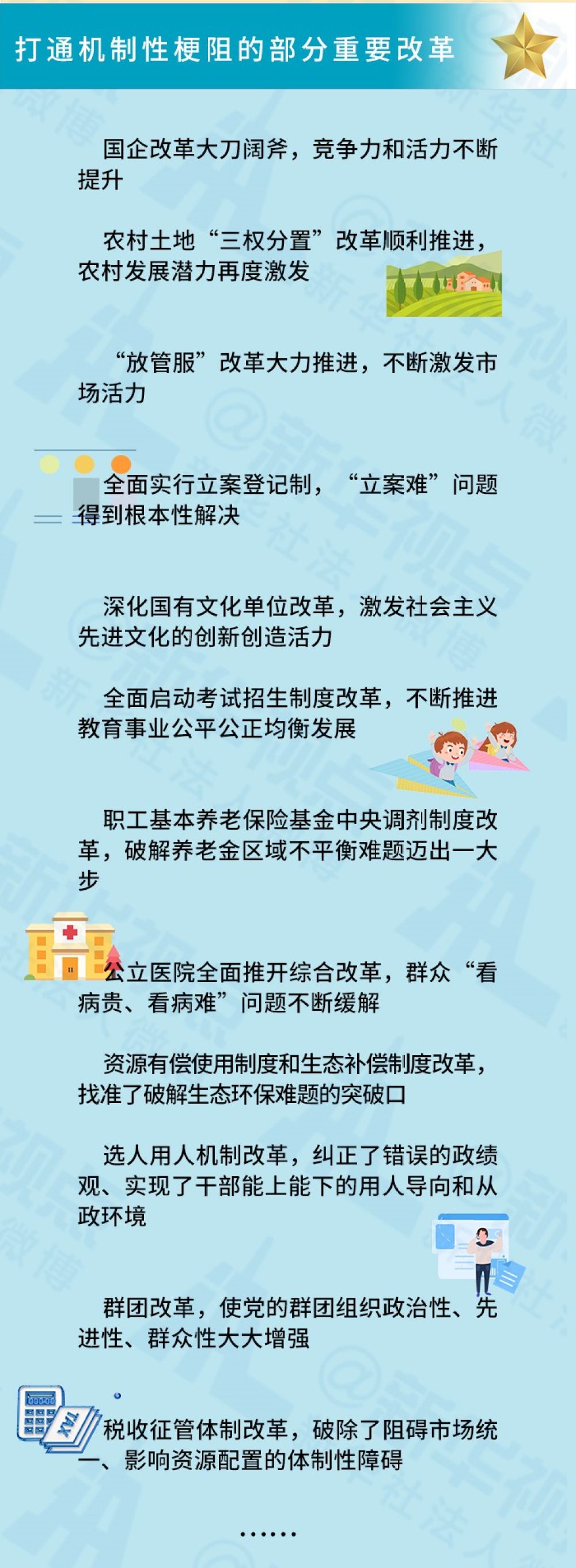 會議是這樣強(qiáng)調(diào)的:“黨的十八屆三中全會以來,我們注重解決體制性的深層次障礙,推出一系列重大體制改革,有效解決了一批結(jié)構(gòu)性矛盾,很多領(lǐng)域?qū)崿F(xiàn)了歷史性變革、系統(tǒng)性重塑、整體性重構(gòu)。我們注重克服機(jī)制性的梗阻問題,打通理順了許多堵點(diǎn)難點(diǎn),增強(qiáng)了全社會發(fā)展活力和創(chuàng)新活力。我們注重從經(jīng)濟(jì)社會發(fā)展需要出發(fā),從老百姓身邊事改起,適時推出一批切口小、見效快的政策性創(chuàng)新,解決了民生領(lǐng)域許多操心事煩心事,增強(qiáng)了人民群眾獲得感、幸福感、安全感。”
