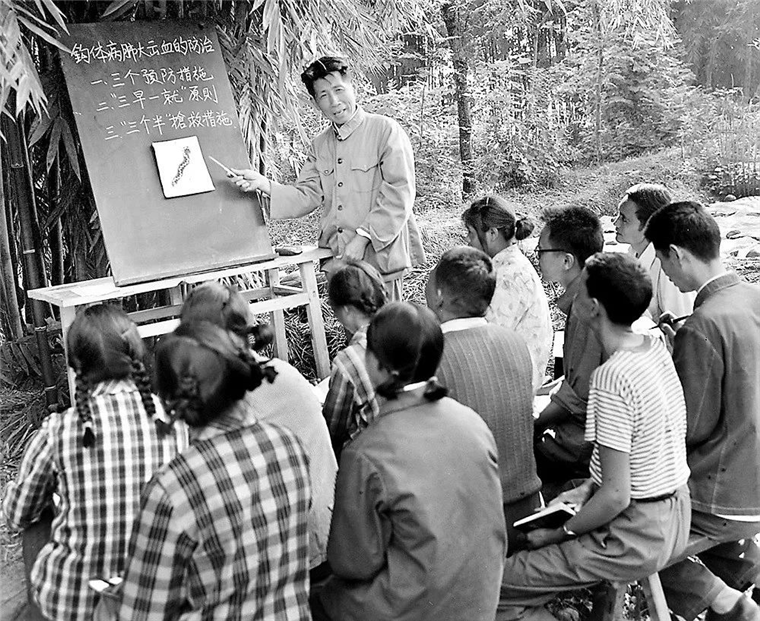 四川醫(yī)學院鉤端螺旋體病防治研究室的教師和醫(yī)務人員,長期堅持鉤體病防治研究工作,取得顯著成效。這是1977年10月,從事鉤體病研究20多年的該室主任戴保民,在給峨眉縣勝利公社勝利大隊的赤腳醫(yī)生講解鉤體病的防治。新華社記者 金勖琪 攝