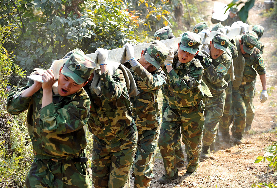 2月14日,南京軍區(qū)某部官兵在陡峭山路上徒步3公里搬運電網器材。
