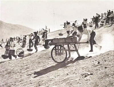 建設(shè)十三陵水庫(kù)時(shí)熱火朝天的勞動(dòng)場(chǎng)面。