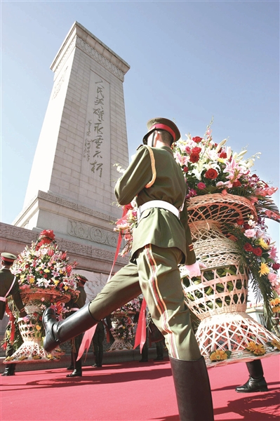 在天安門(mén)廣場(chǎng)人民英雄紀(jì)念碑前舉行的向人民英雄敬獻(xiàn)花籃儀式。(資料圖片)