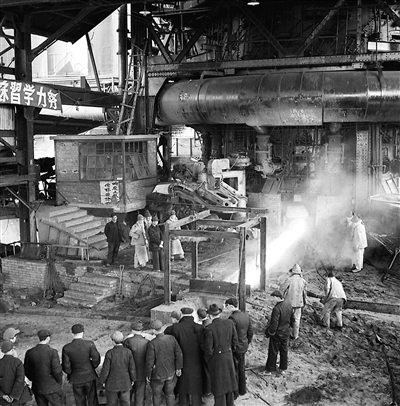 1953年3月11日,我國第一座自動化的煉鐵爐——鞍山鋼鐵公司第8號煉鐵爐開始出鐵了。鐵水經(jīng)過化驗,質(zhì)量很好。這是開始出鐵時,冶金部門的領(lǐng)導(dǎo)同志、蘇聯(lián)專家等正在參觀的情形。