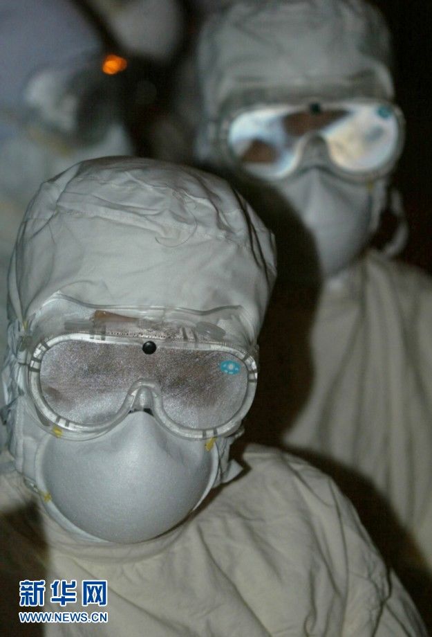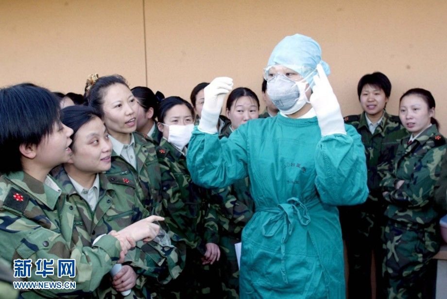 2003年4月29日,奉命前來北京小湯山定點醫(yī)院支援北京防治“非典”的軍隊醫(yī)護人員在進行自身防護培訓。新華社記者王建民攝