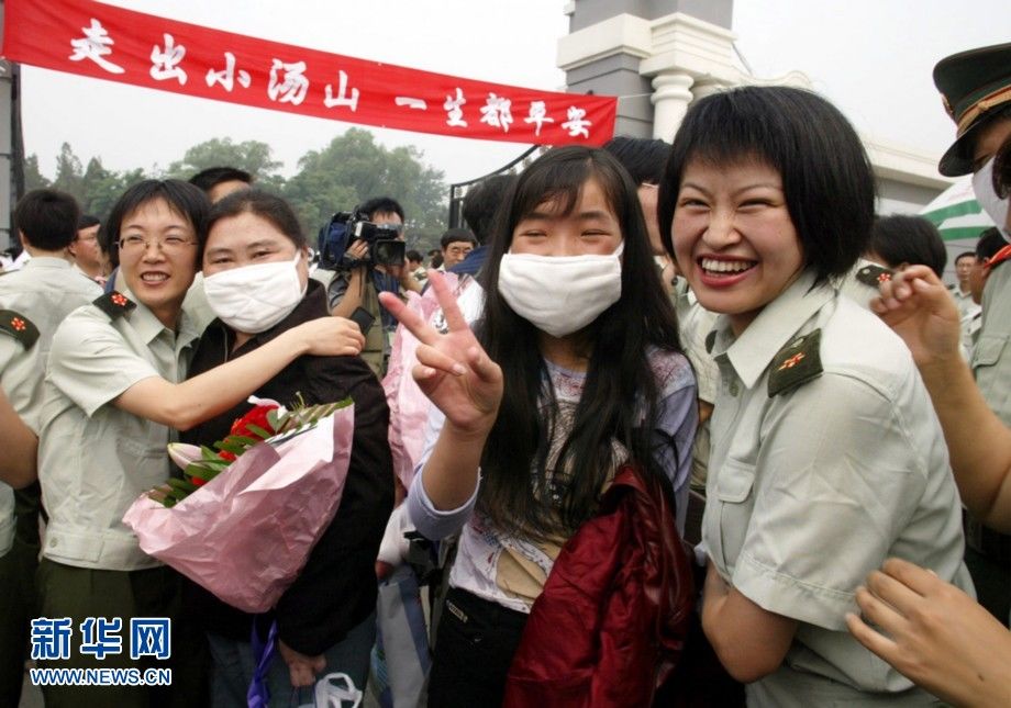 2003年6月20日,小湯山醫(yī)院的最后一批非典治愈者出院時與醫(yī)務人員深情告別。新華社記者王建民攝