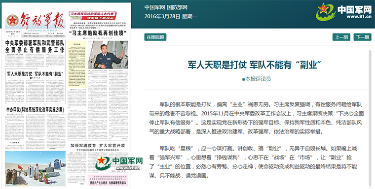 軍隊的根本職能是打仗,偏離“主業(yè)”禍患無窮。習主席作出全面停止軍隊有償服務(wù)的果斷決策,全軍上下拍手稱快。今年6月,人才培訓(xùn)、基建營房工程技術(shù)、儲運設(shè)施等10個行業(yè)全面徹底停止有償服務(wù)。