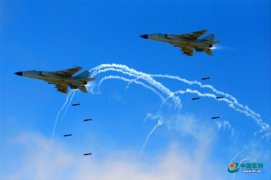 我軍殲轟機對“敵”陣地實施精準打擊。