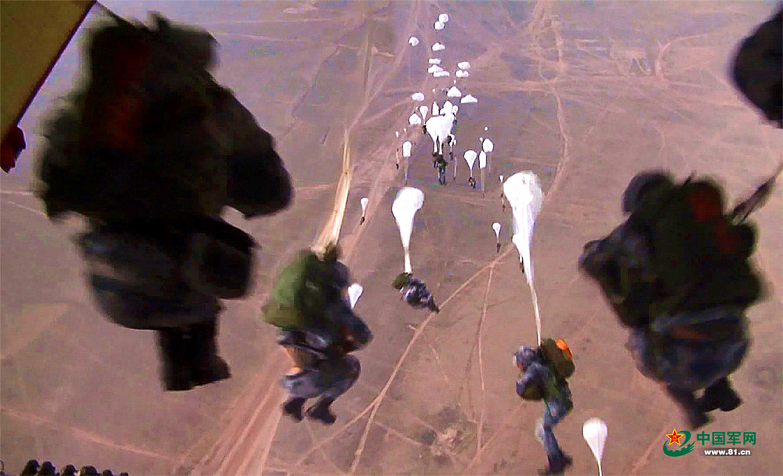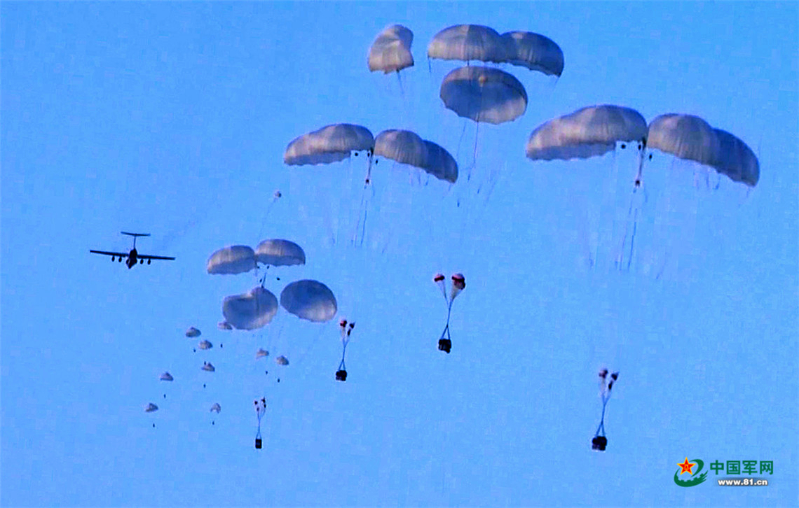 13時17分,我運輸機群飛抵預(yù)定空域,天空隨即綻放朵朵傘花,全副武裝的空降戰(zhàn)斗員直撲戰(zhàn)場。2分鐘后,4架直-10戰(zhàn)機馭風飛來,時而垂直打擊,時而俯沖攻擊。