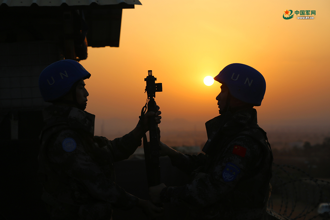中國赴南蘇丹維和步兵營守衛(wèi)難民營安全,哨兵在晨曦中交接職責(zé)。
