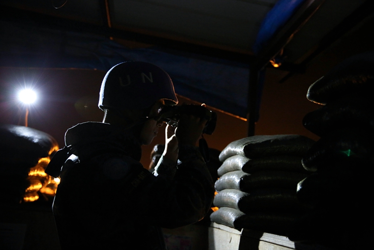 11月15日深夜,在南蘇丹首都朱巴的聯(lián)合國維和營區(qū),中國維和步兵營一連連長李雙在哨位上執(zhí)勤。