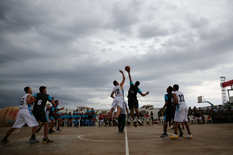 11月16日,在南蘇丹首都朱巴的中國維和步兵營營區(qū),中國維和步兵營官兵和友軍舉行籃球友誼賽。