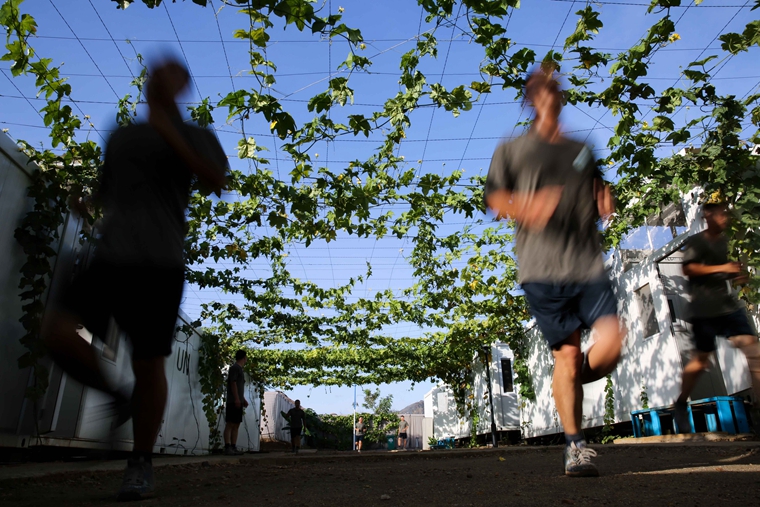 11月15日,在南蘇丹首都朱巴的中國維和步兵營營區(qū),官兵們進行體能訓練。