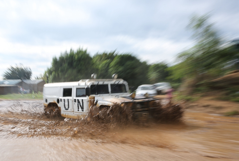 11月14日,在南蘇丹首都朱巴,中國維和步兵營車輛從一處水坑中駛過。