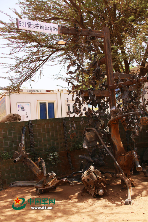 近日,在聯(lián)合國駐馬里多層面綜合穩(wěn)定團(tuán)中國警衛(wèi)分隊營區(qū)的院子里,設(shè)立了一根警示柱。這根警示柱由5月31日20時51分29秒營區(qū)遭受汽車炸彈恐怖襲擊后散落在營區(qū)內(nèi)的1731塊汽車碎片制成,它靜靜地矗立在英雄李濤受傷的地方,無聲的控訴著國際恐怖組織的罪行,激勵著中國維和官兵在戰(zhàn)火硝煙里奮勇前行。