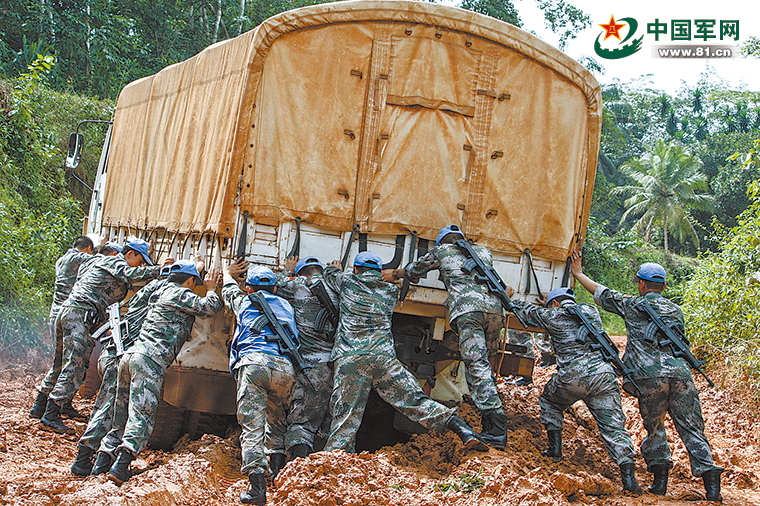 中國赴利比里亞維和部隊(duì)運(yùn)輸分隊(duì)官兵在泥濘的道路上推車。穿梭在利比里亞的原始叢林中,中國藍(lán)盔時(shí)常遭遇各種惡劣路況。國防部維和事務(wù)辦公室提供