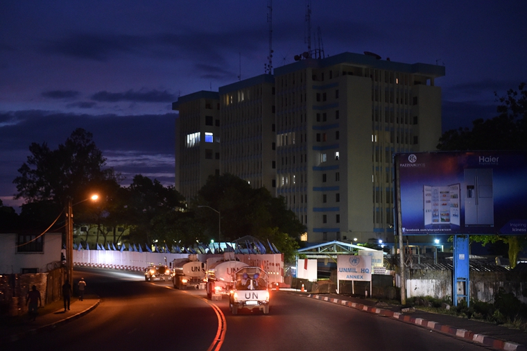 執(zhí)行油料運(yùn)輸任務(wù)的中國第18批赴利比里亞維和運(yùn)輸分隊(duì)車隊(duì)駛過聯(lián)合國利比里亞特派團(tuán)總部。