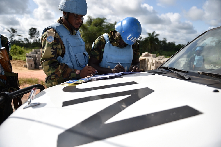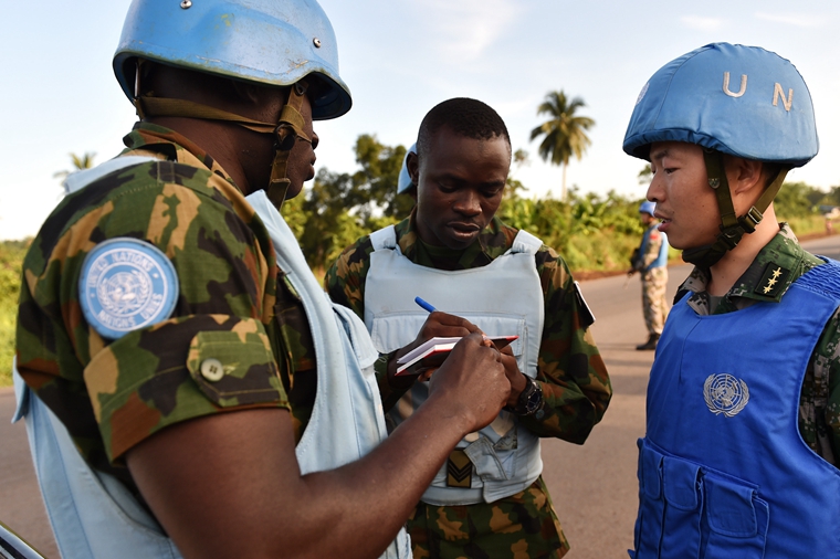 在利比里亞邦縣,尼日利亞維和士兵(右)和加納維和士兵交接對(duì)中國(guó)油料運(yùn)輸車隊(duì)的護(hù)衛(wèi)任務(wù)。