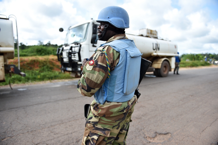 一名加納維和士兵在中國(guó)油料運(yùn)輸車隊(duì)停車檢查時(shí)警戒。