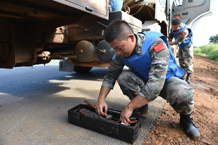 在利比里亞馬及比縣,中國(guó)第18批赴利比里亞維和運(yùn)輸分隊(duì)四級(jí)軍士長(zhǎng)王偉檢修車輛后整理工具。
