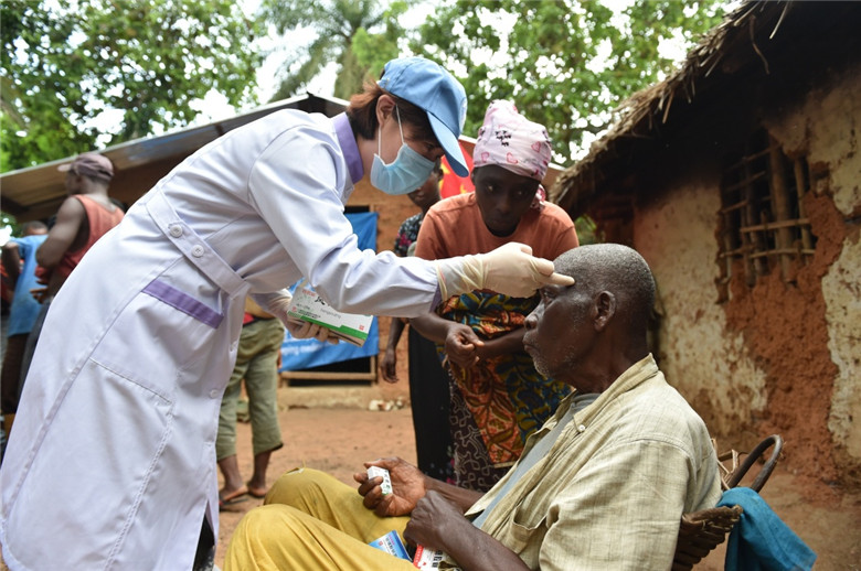 這是2015年11月1日,在利比里亞綏德魯市附近村莊,中國第18批赴利比里亞維和部隊醫(yī)療分隊護士長李煒為一名當地老人講解如何用藥。新華社記者 孫瑞博 攝