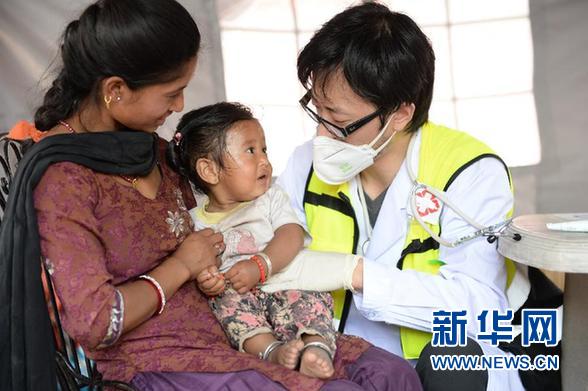 5月3日,在尼泊爾巴德崗重災(zāi)區(qū),中國紅十字國際救援隊(duì)武警總醫(yī)院醫(yī)療分隊(duì)隊(duì)員為受災(zāi)民眾看病。 新華社發(fā)(程瑩攝)