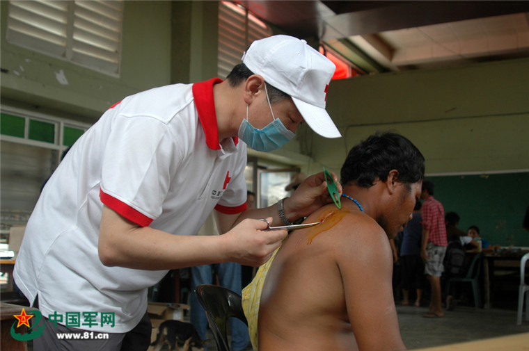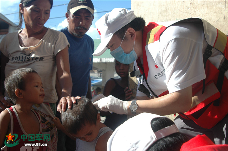 醫(yī)療隊(duì)員為災(zāi)區(qū)兒童清理創(chuàng)傷。