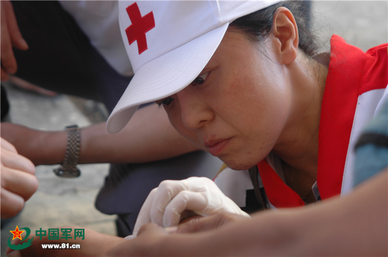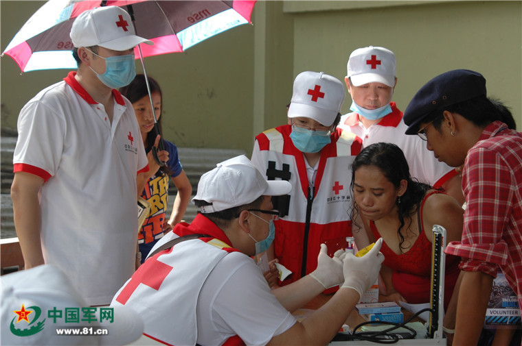 醫(yī)療隊(duì)員為災(zāi)民診斷病情。
