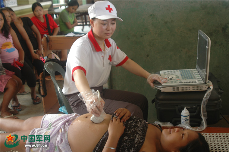 醫(yī)療隊(duì)員在固定醫(yī)療救助點(diǎn)為孕婦做檢查。