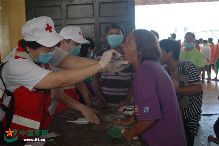 醫(yī)療隊(duì)員為災(zāi)民進(jìn)行口腔檢查。