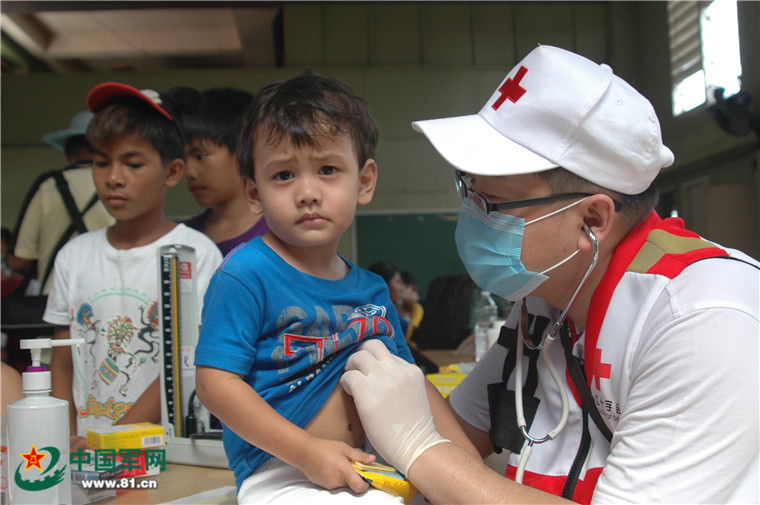 醫(yī)療隊(duì)員為災(zāi)區(qū)兒童進(jìn)行心肺檢查。