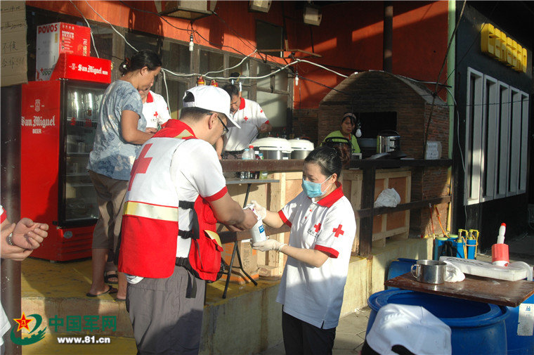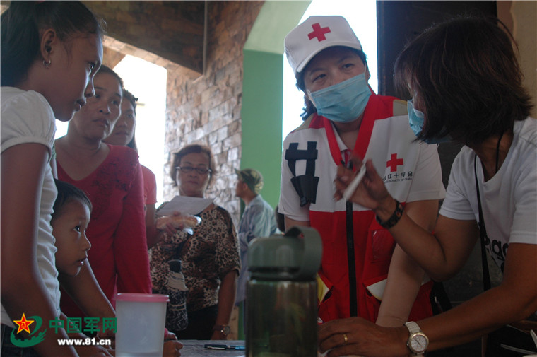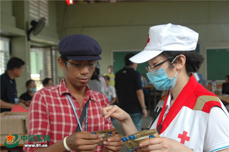 醫(yī)療隊(duì)員為災(zāi)民講解用藥知識(shí)。