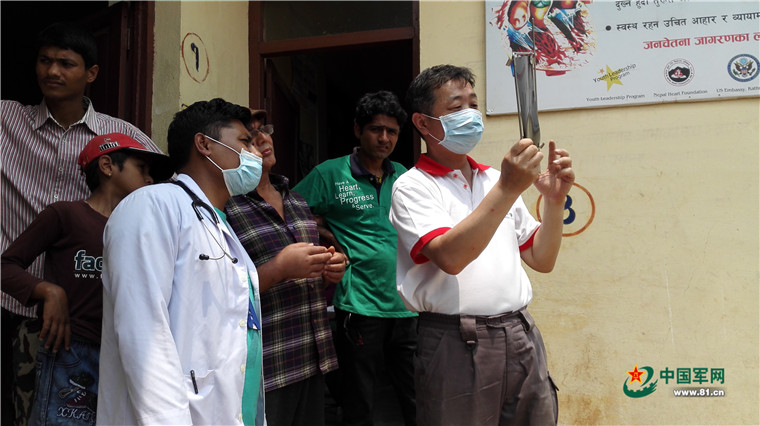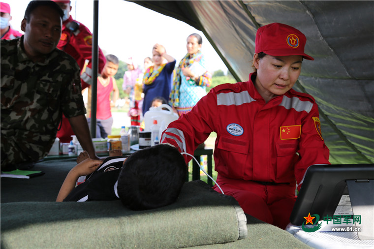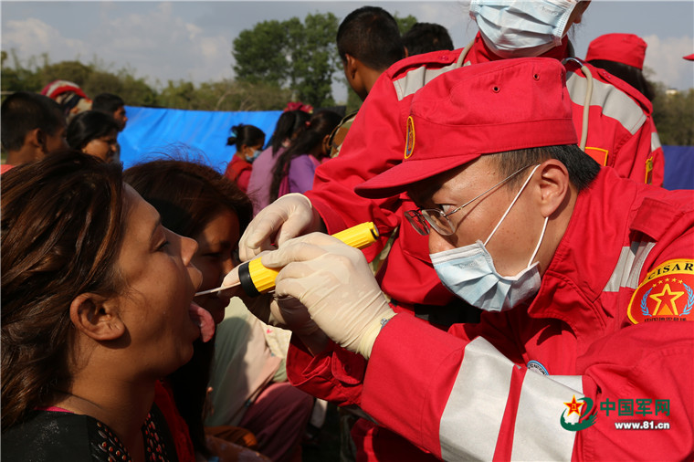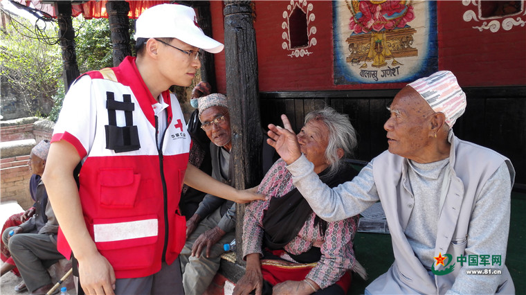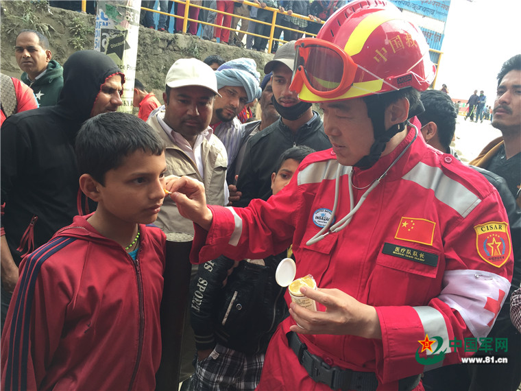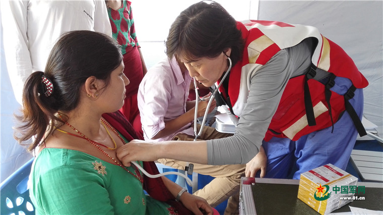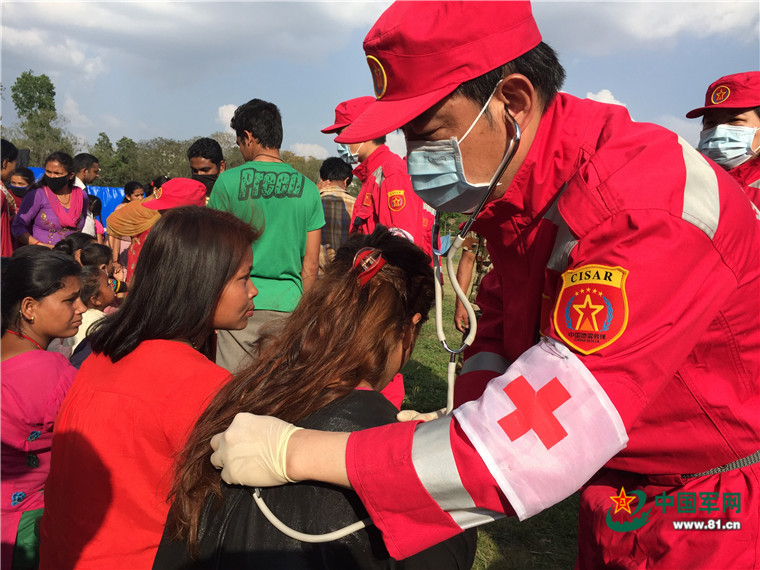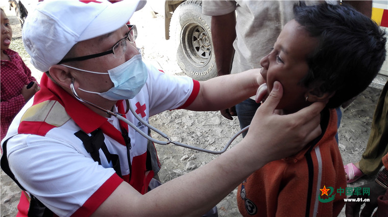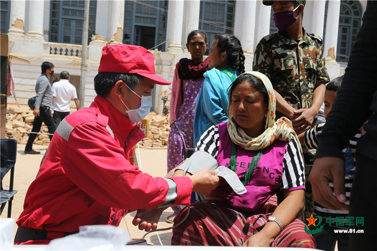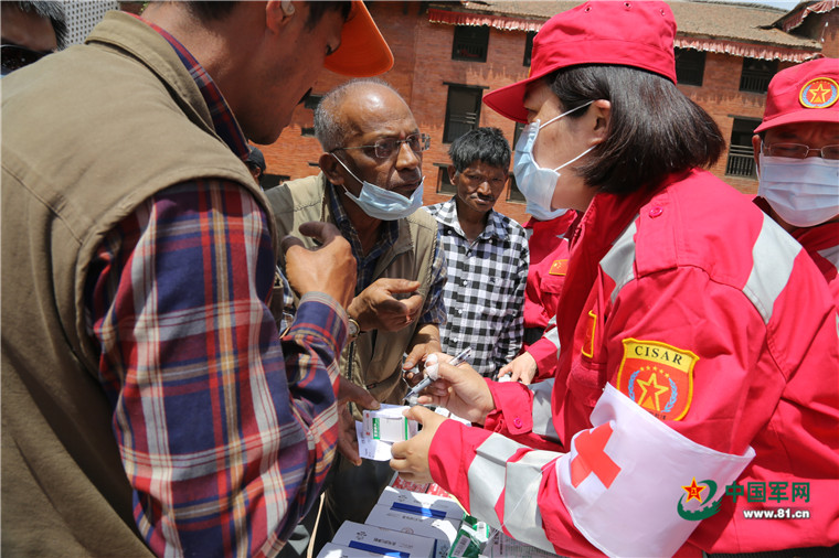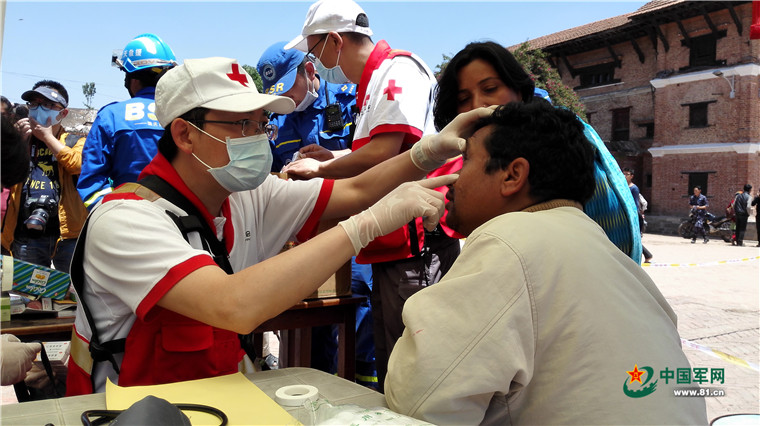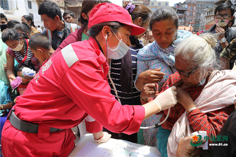 尼泊爾8.1級強(qiáng)烈地震大救援。2015年5月8日,中國武警交通救援大隊(duì)為尼泊爾民眾提供醫(yī)療援助。涂敦法 攝