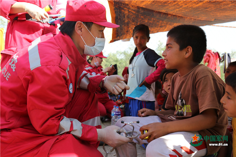 醫(yī)療隊(duì)員為受傷兒童做檢查。