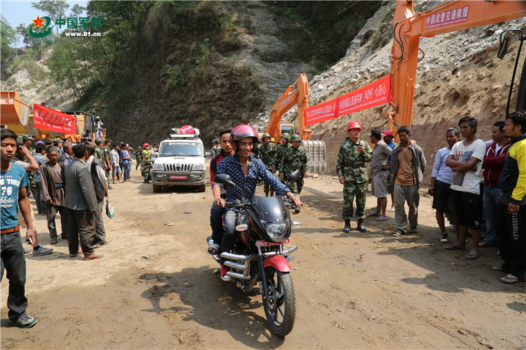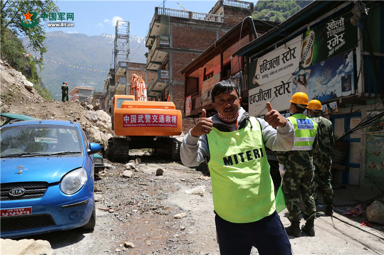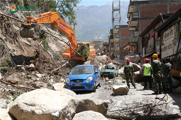 尼泊爾8.1級強(qiáng)烈地震大救援。2015年5月8日,中國武警交通救援大隊(duì)成功搶通中斷道路。涂敦法 攝