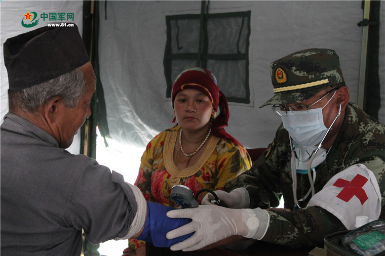 醫(yī)療隊(duì)員為災(zāi)民做檢查。
