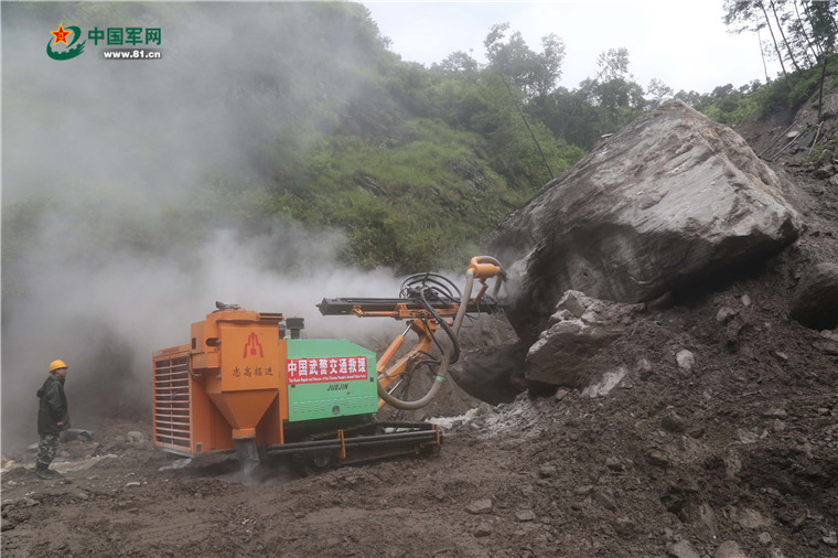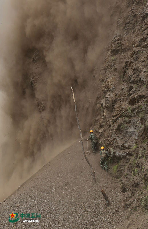 赴尼泊爾搶通阿尼哥公路。2015年8月3日,官兵對塌方路段巨石進(jìn)行爆破清理。涂敦法 攝