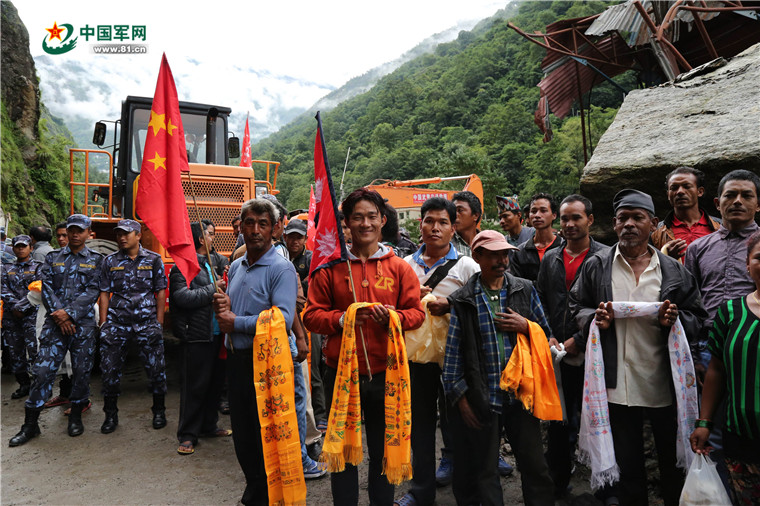 赴尼泊爾搶通阿尼哥公路。2015年8月1日,中國武警交通救援突擊隊(duì)赴尼搶通救援,尼民眾自發(fā)趕來歡迎。涂敦法 攝