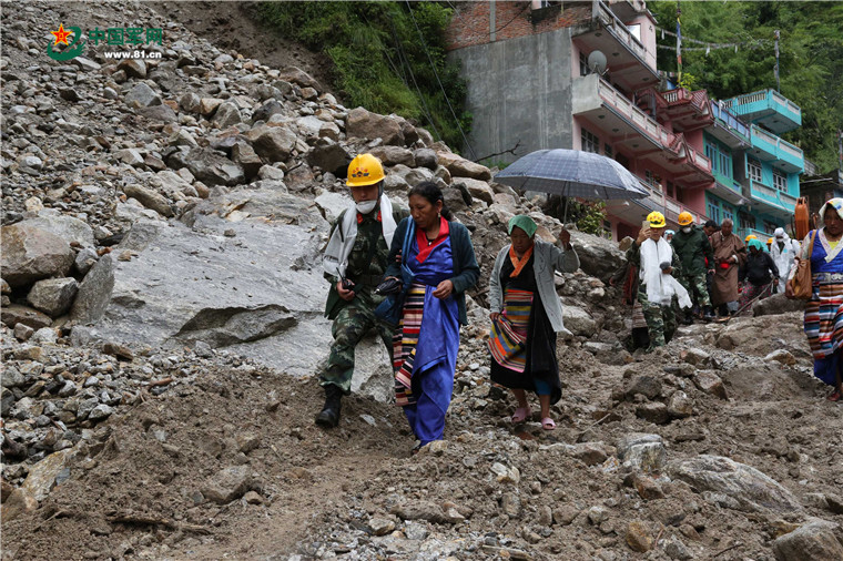 赴尼泊爾搶通阿尼哥公路。2015年8月2日,官兵護(hù)送尼民眾安全通過塌方去。涂敦法 攝