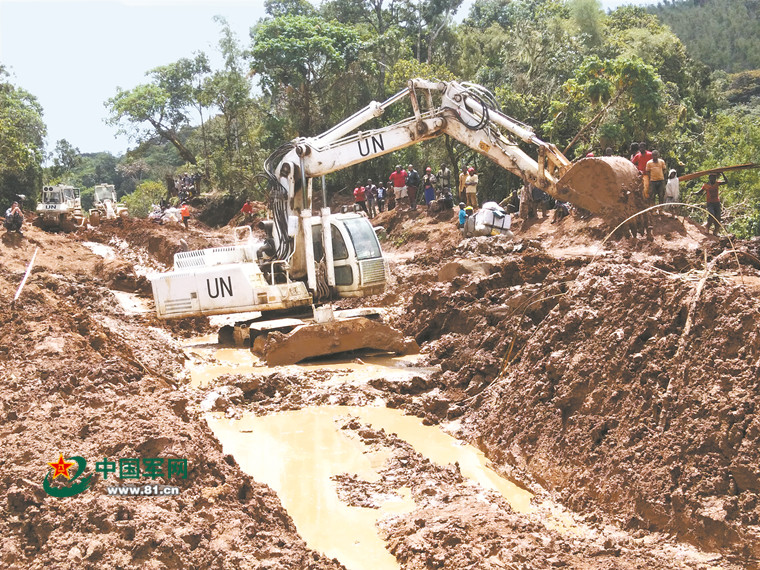 中國(guó)第21批赴剛果(金)維和工兵分隊(duì)官兵在叢林中緊張施工。王 俊攝