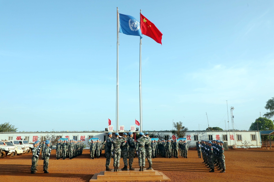 2019年5月1日,在南蘇丹瓦烏,中國(guó)維和工兵舉行升旗儀式。新華社發(fā)(賈方文 攝)