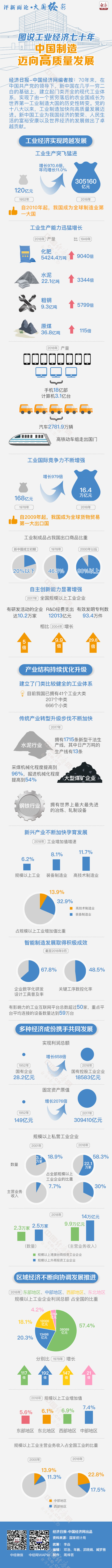編者按:70年來,在中國共產(chǎn)黨的領(lǐng)導(dǎo)下,新中國在幾乎一窮二白的基礎(chǔ)上,建立起門類齊全的現(xiàn)代工業(yè)體系,實(shí)現(xiàn)了由一個(gè)貧窮落后的農(nóng)業(yè)國成長為世界第一工業(yè)制造大國的歷史性轉(zhuǎn)變。黨的十八大以來,工業(yè)制造加快向高質(zhì)量發(fā)展邁進(jìn)。新中國工業(yè)為我國經(jīng)濟(jì)的繁榮、人民生活的富裕安康以及世界經(jīng)濟(jì)的發(fā)展做出了卓越貢獻(xiàn)。