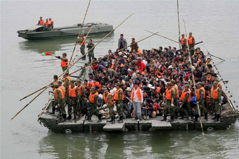 ↑2008年5月15日,解放軍官兵在岷江汶川縣映秀鎮(zhèn)至都江堰段使用大型水上運輸裝備轉(zhuǎn)運災民。 新華社記者 查春明 攝