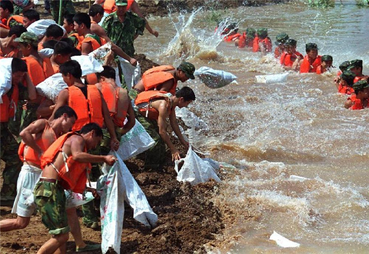 ↑解放軍官兵在湖北石首久合垸鄉(xiāng)團山河支堤“管涌”險情處抗洪搶險(1998年8月11日攝)。 新華社記者 李剛 攝