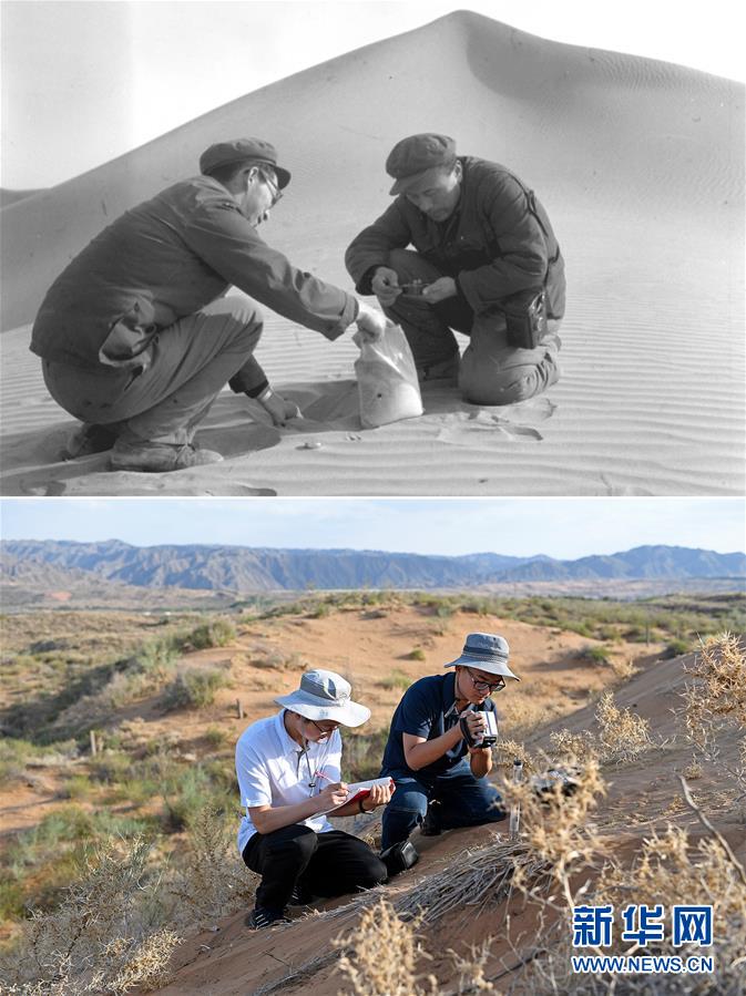 拼版照片:上圖為1979年,中國科學(xué)院新疆分院生物沙漠土壤研究所科研人員夏訓(xùn)誠(右)在羅布泊西部取沙漠樣品(新華社記者趙昌春攝);下圖為2019年5月30日,中國生態(tài)系統(tǒng)研究網(wǎng)絡(luò)沙坡頭沙漠試驗(yàn)研究站工作人員王炳堯(右)、李云飛在寧夏中衛(wèi)市境內(nèi)騰格里沙漠南緣檢測沙丘表面溫度(新華社記者王鵬攝)。