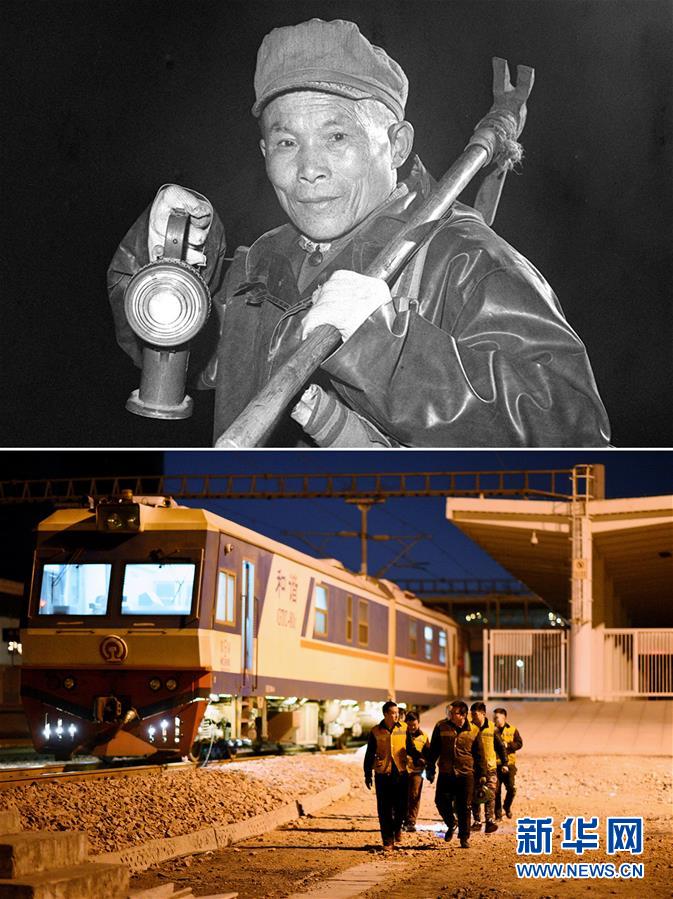拼版照片:上圖為1977年,河南鄭州鐵路局信陽分局孝子店養(yǎng)路工區(qū)巡道工蘆利連在夜間巡道(新華社記者樊鳴濤攝);下圖為2019年1月21日,中國鐵路鄭州局集團(tuán)有限公司鄭州工務(wù)機(jī)械段的鋼軌探傷工準(zhǔn)備出乘作業(yè)(新華社記者李安攝)。